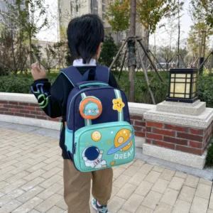 The backpack showcases a charming space design with planets, stars, and a smiling astronaut, inspiring kids to dream big and explore the unknown