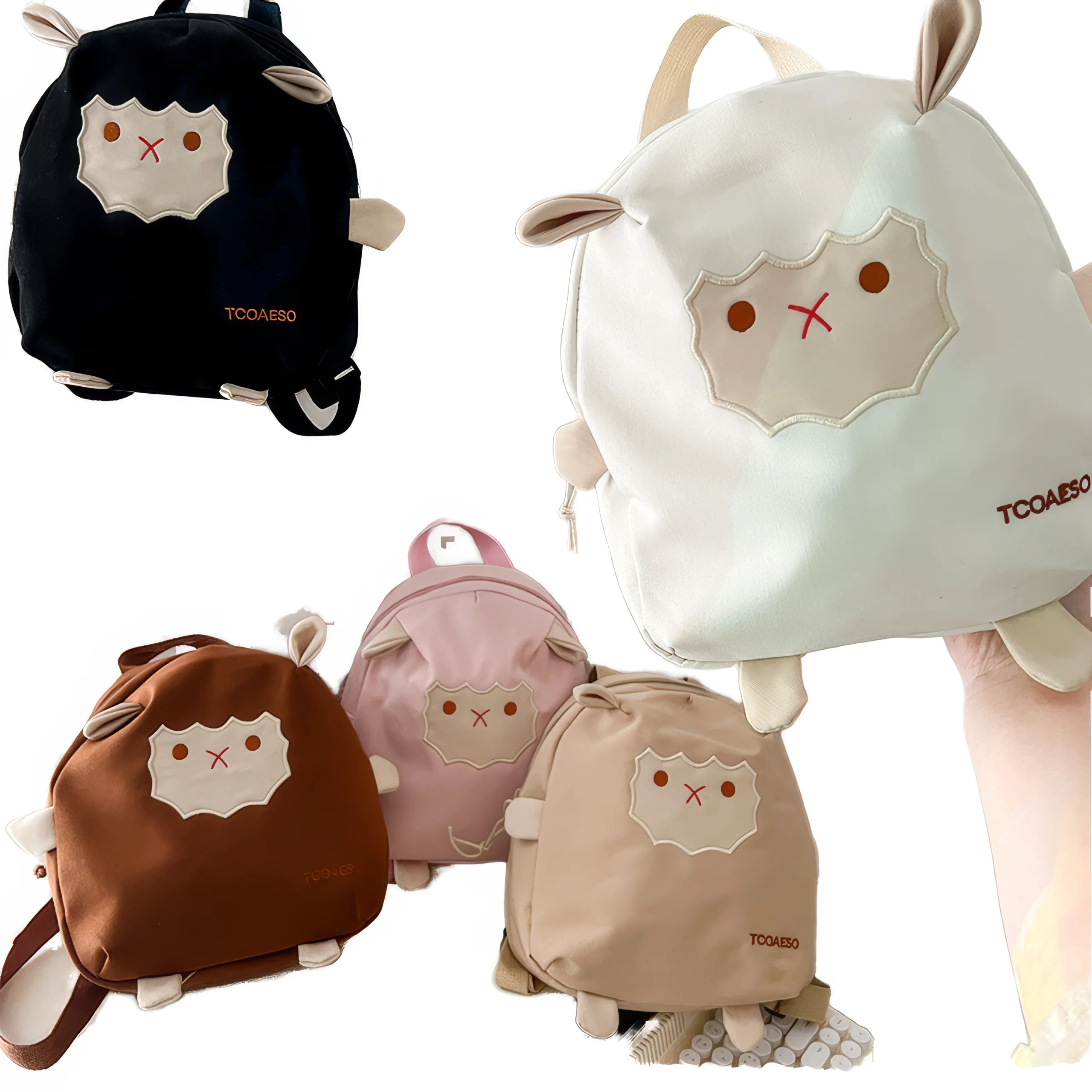 A soft beige backpack with a playful embroidered face and tiny ears, perfect for toddlers and young kids who love a touch of personality in their everyday gear
