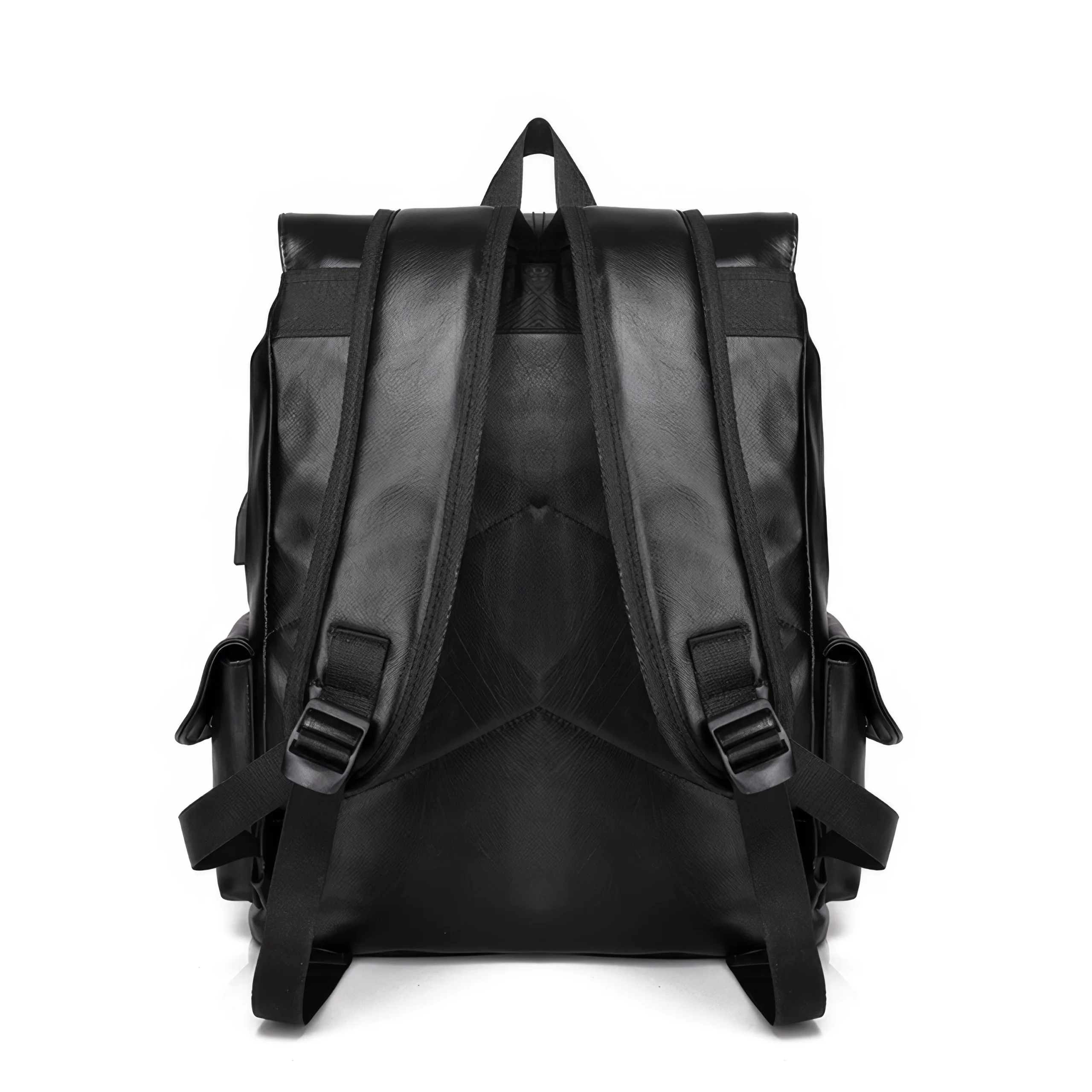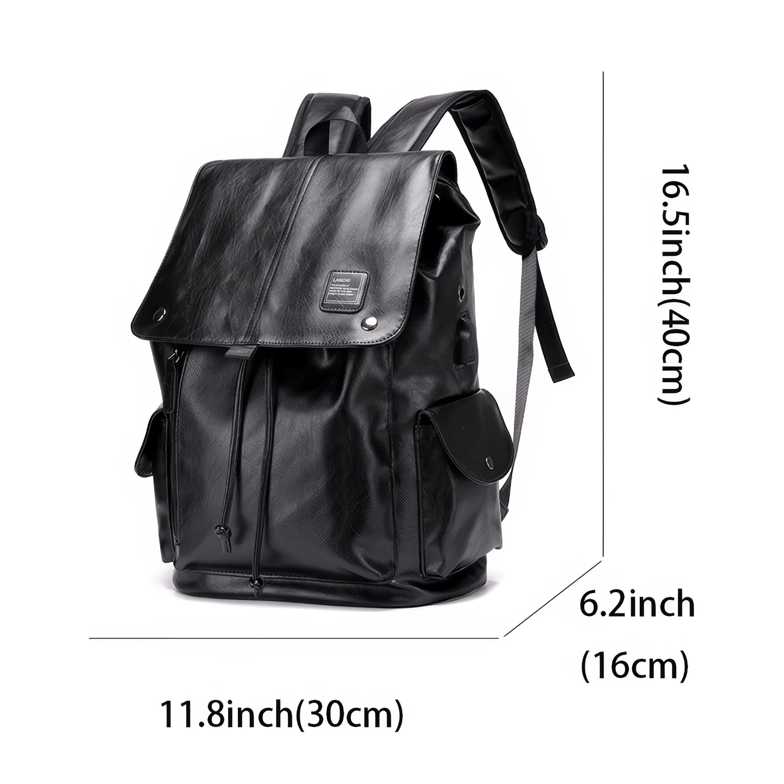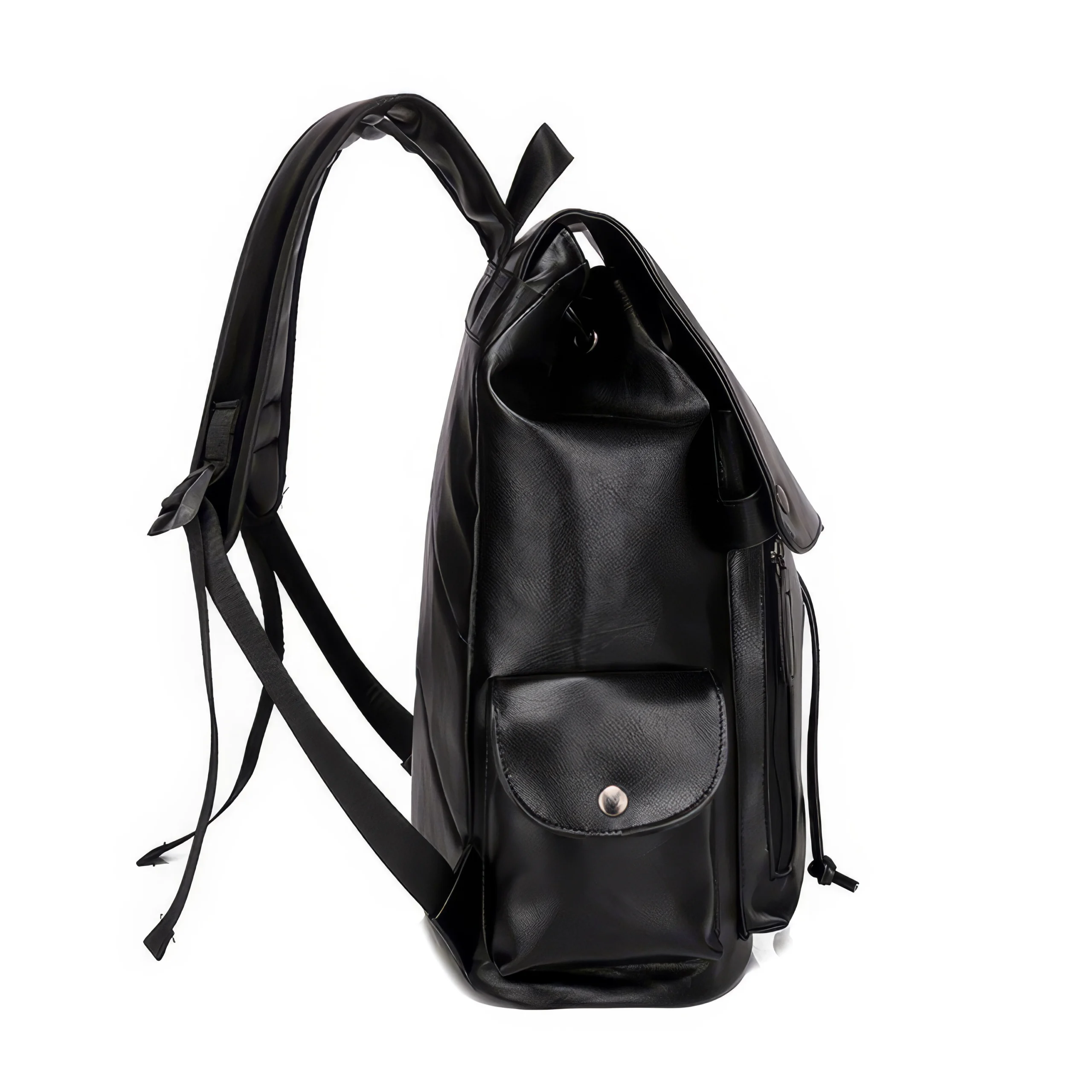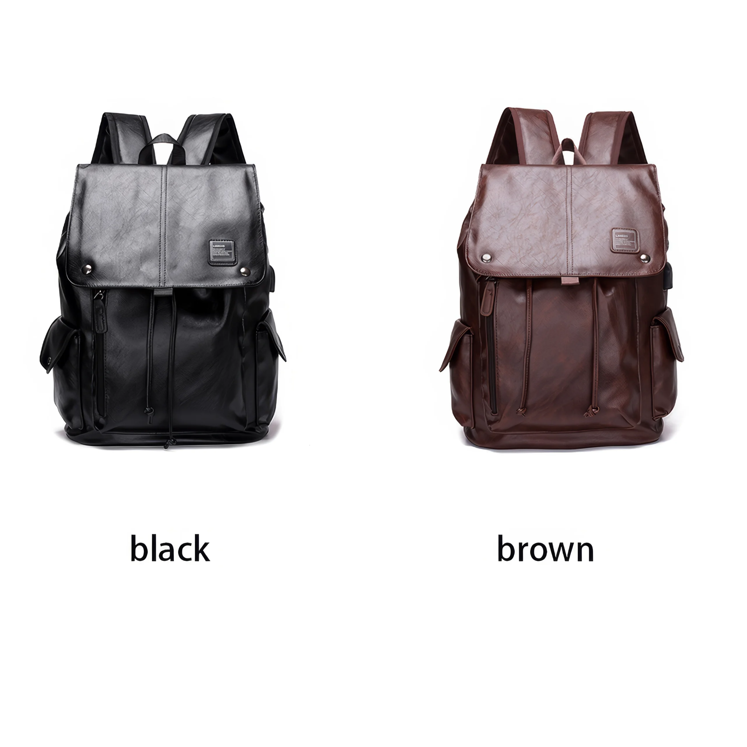 A sleek and stylish leather-look backpack with flap cover, side pockets, and secure drawstring closure. Available in black or brown.