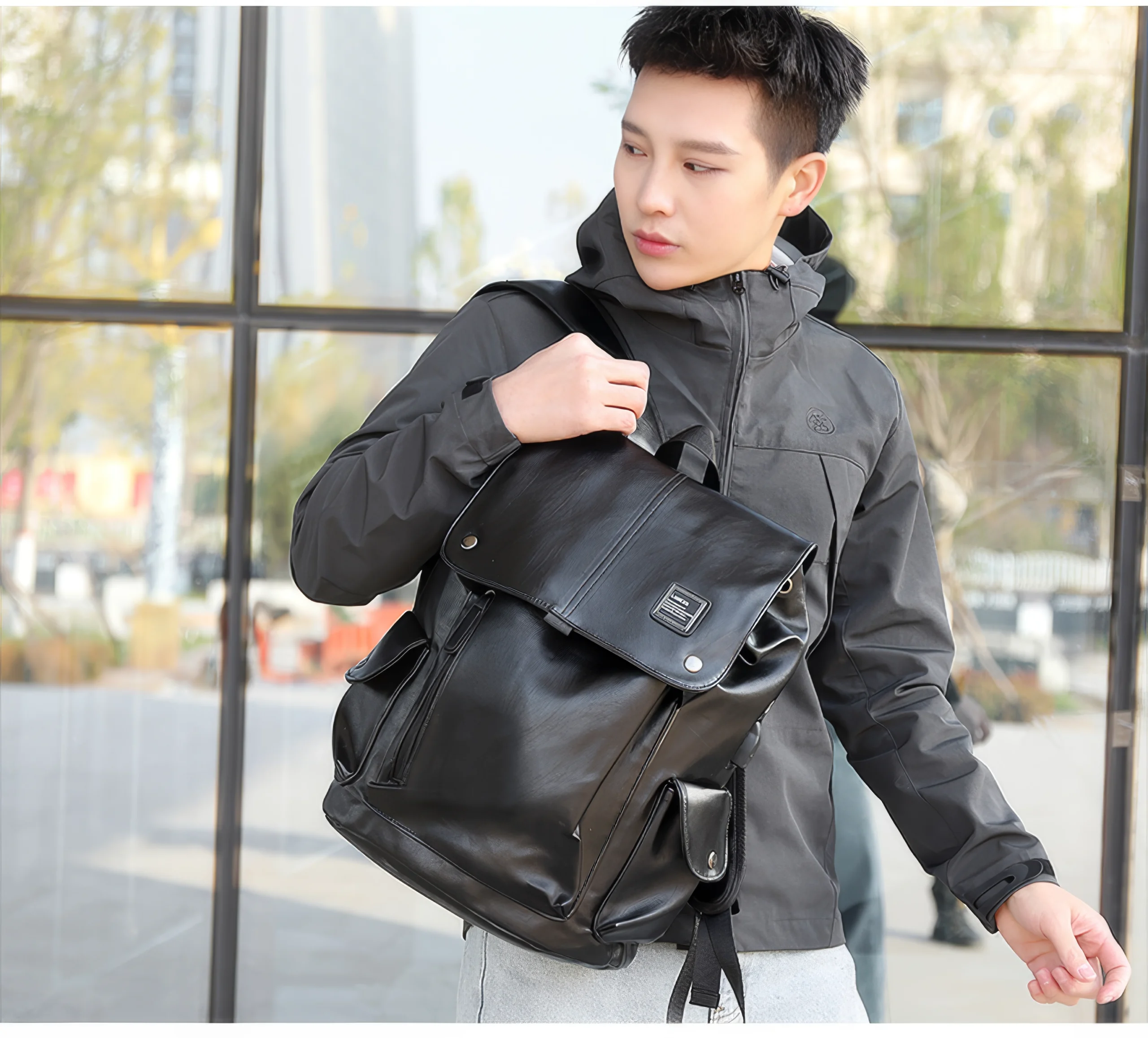 This backpack is a perfect blend of streetwear and executive style. With its matte faux leather finish and flap-over top, it adds elegance to your everyday look.